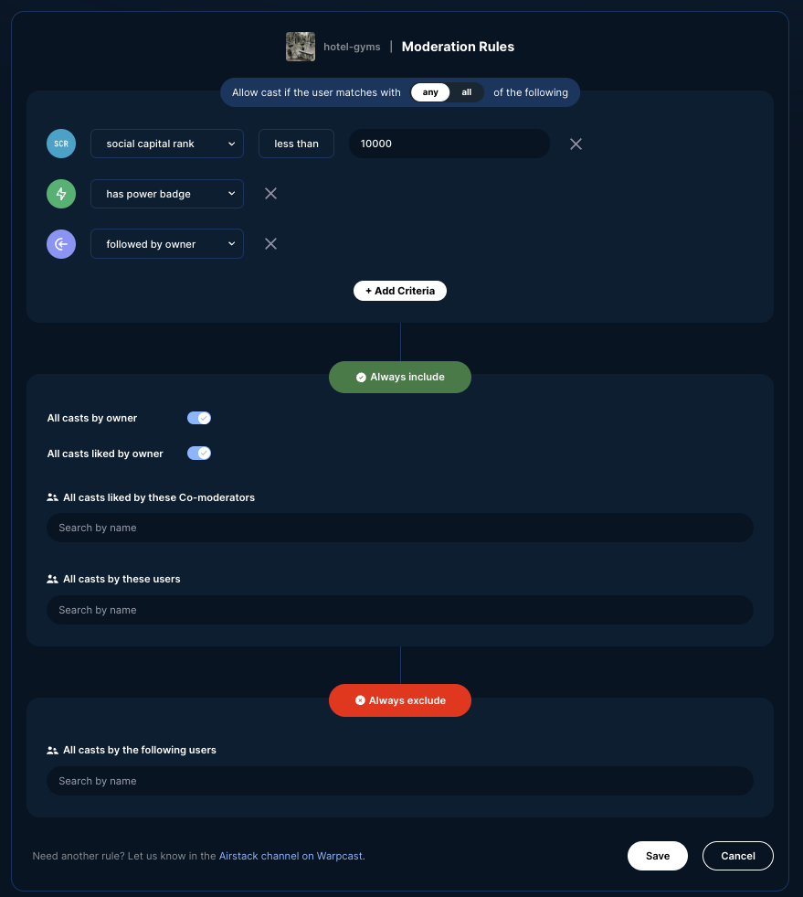 AirstackAirstack Channel Co-ModeratorsAirstack Channel Co-ModeratorsLaunch! Channel Co-Moderators! By default your airstack moderated channel Main Feed can now include: 1. All casts by users with Social Capital Rank Loading...detailslaunched Jun 6, 2024farcaster