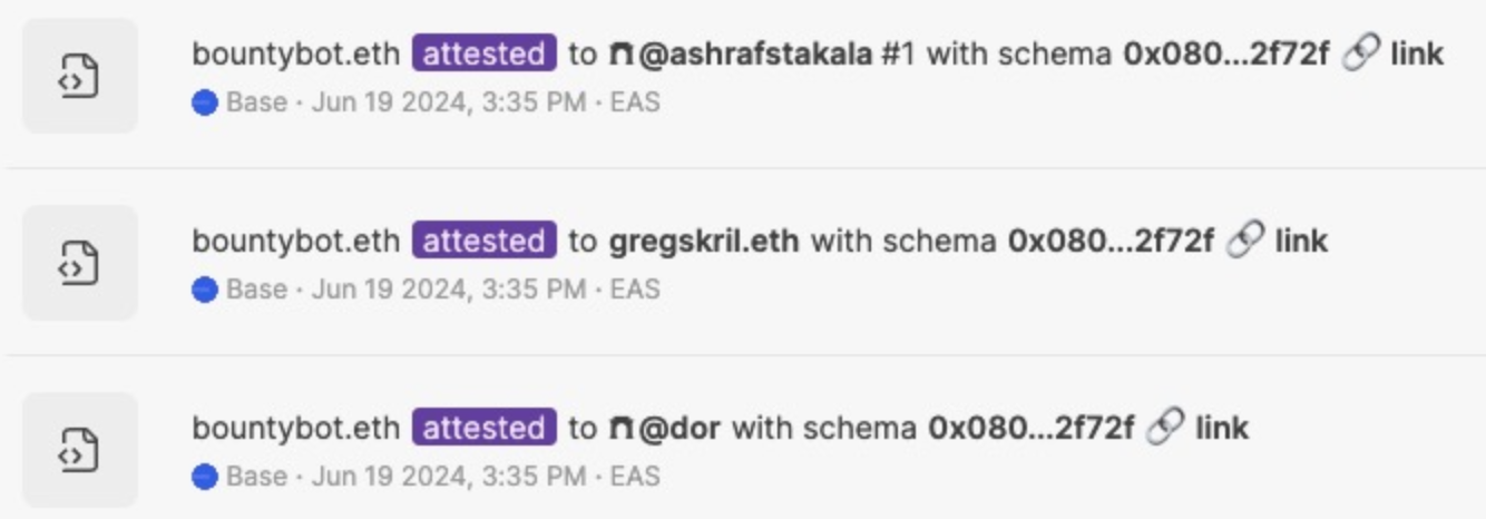 Now all bounty completions are attested onchain with Base via EAS (Ethereum Attestation Service)