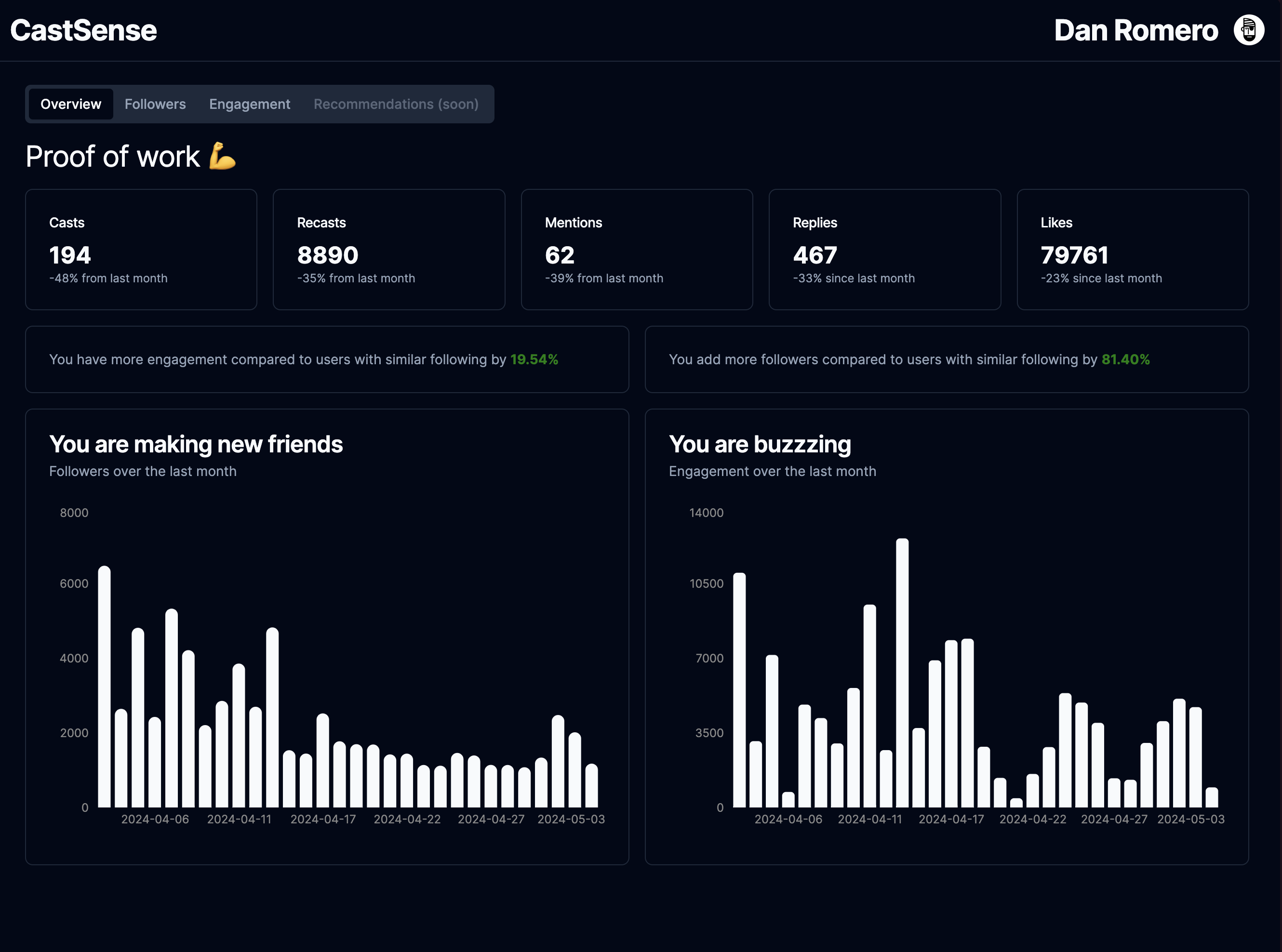 Castsense.xyz for interesting insights on your farcaster account