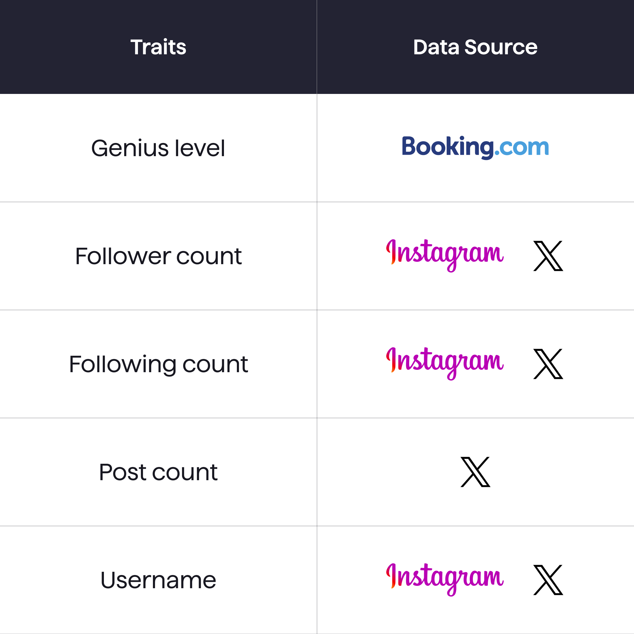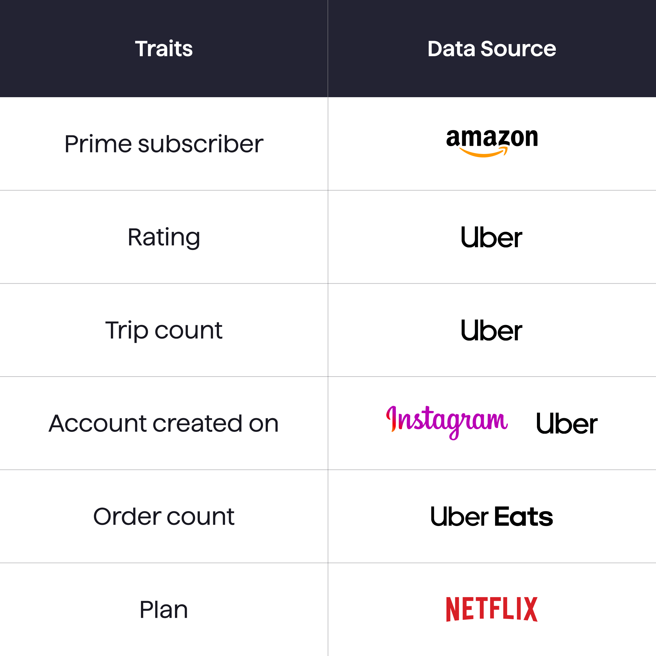 Traits provide specific data points like Uber ratings or Amazon Prime status, giving a quick snapshot of a user’s profile on supported platforms.