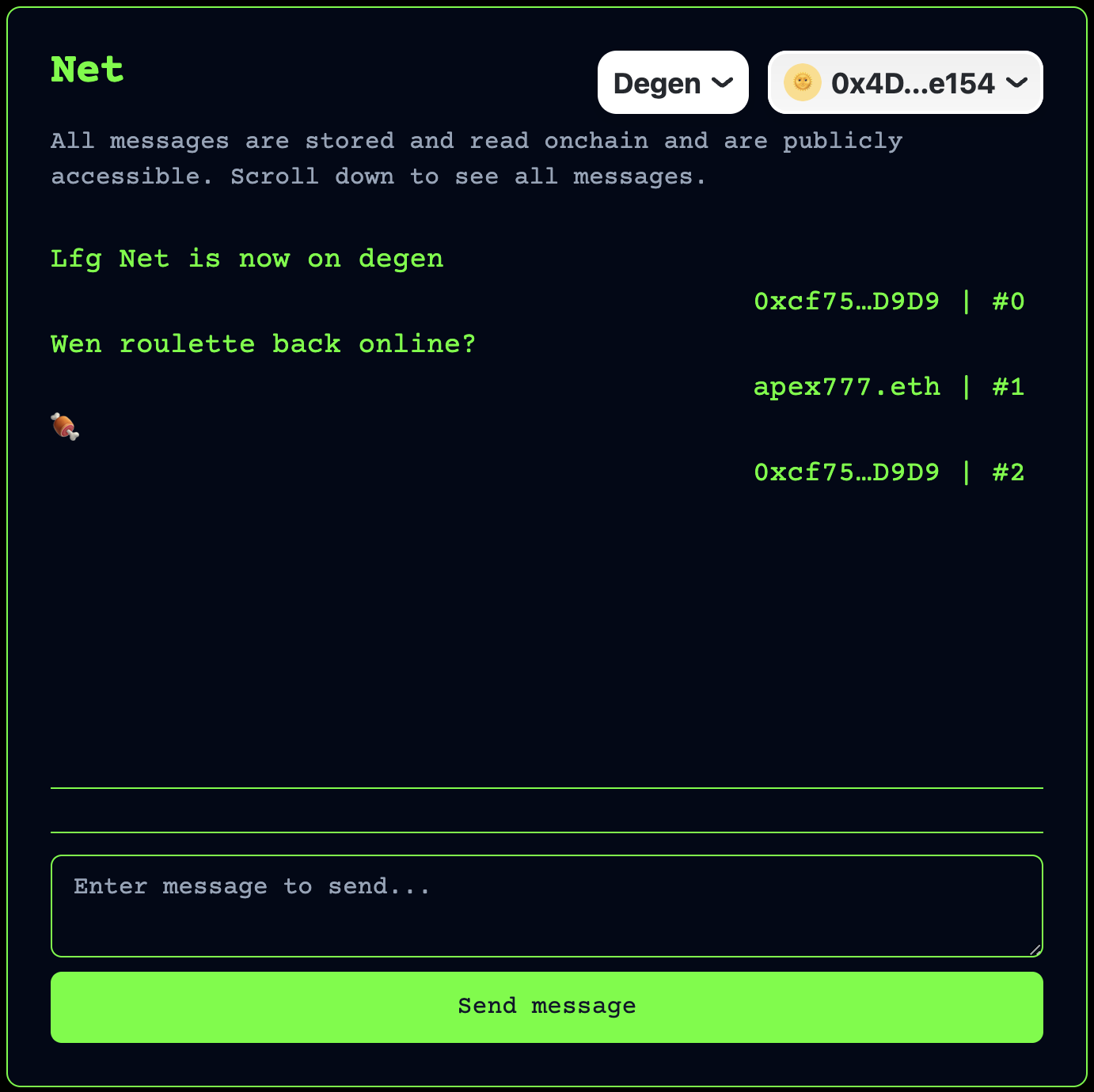 Net is a free onchain messaging protocol where anybody can send messages and all messages are stored entirely on the degen chain