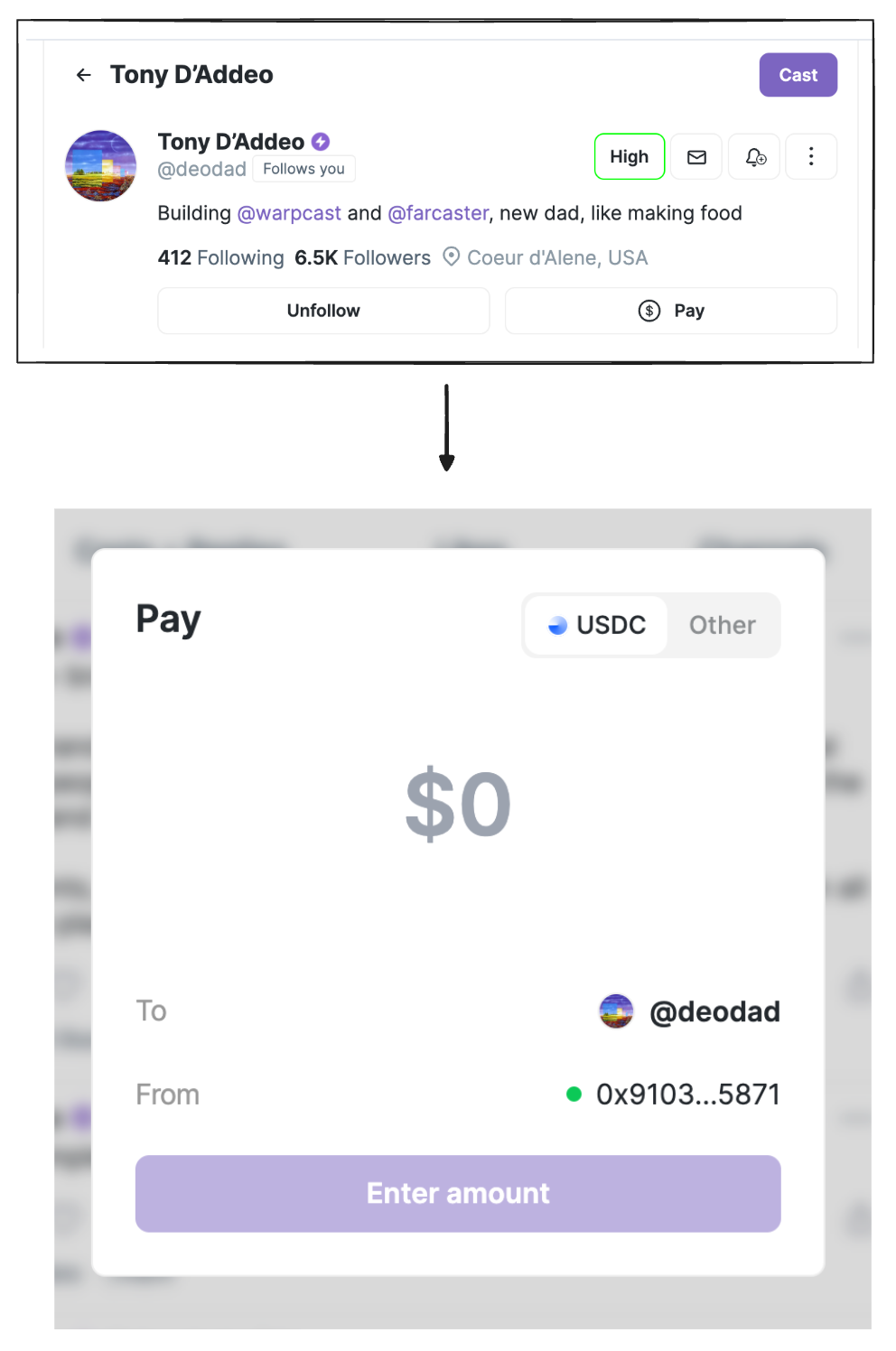 Send money onchain by tapping "Pay" on a profile or cast menu. They are: