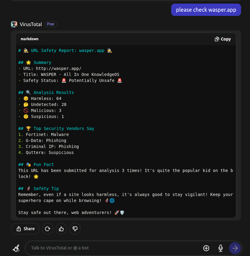 You can now call in "@VirusTotal check " to any POE Chat and receive a summary of what is known about the site on VT