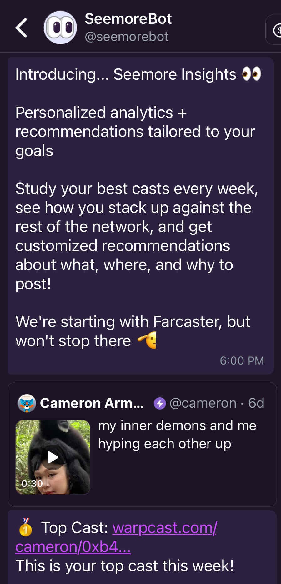 Starting with Farcaster, all Seemore Creators now have personalized content insights + casting recommendations straight to your DC inbox 🫡